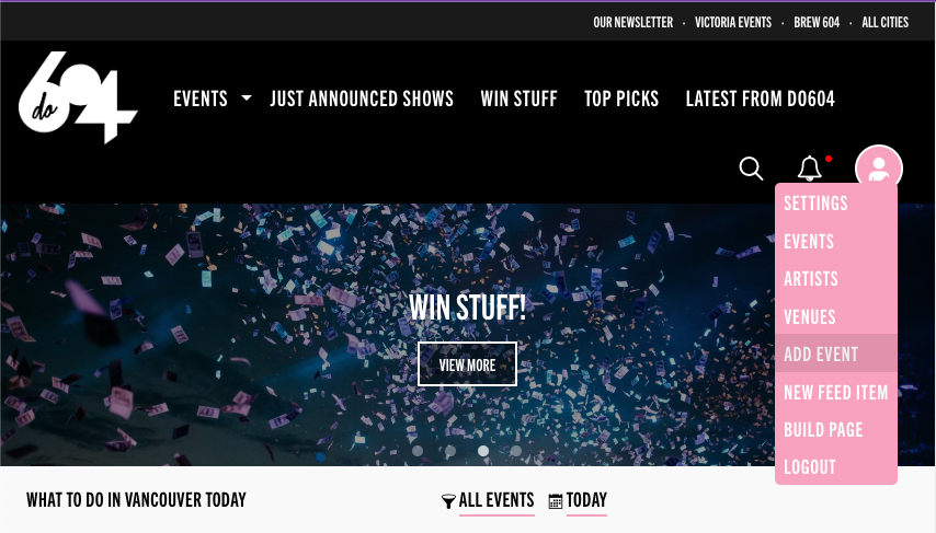 1. Once you have gained editing permissions, login on Do604. Hover over your user icon in the upper right-hand corner. Then click, "Add Event."