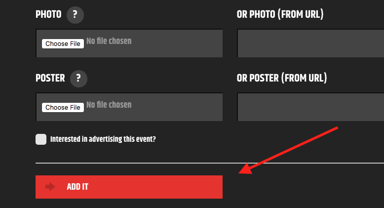 2. Fill out the basic event details, making sure to include the required info, and click “Add It”. Be sure to upload a (text-free)* PHOTO image for your title background and a POSTER image if you have a flyer of information you would like attached.