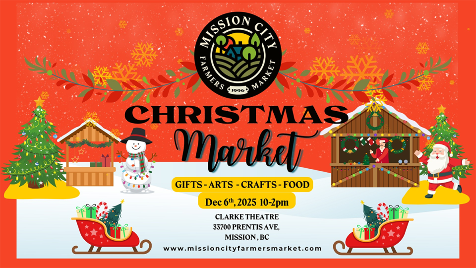 Get in the holiday spirit with Mission City Farmers Market - Indoor Christmas Market 2025 — happening Saturday, December 6 at Clarke Theatre (Mission, BC). Expect 40+ local vendors, cozy indoor market vibes, handmade gifts, artisan goods, festive treats and more — the perfect way to kick off your holiday shopping.